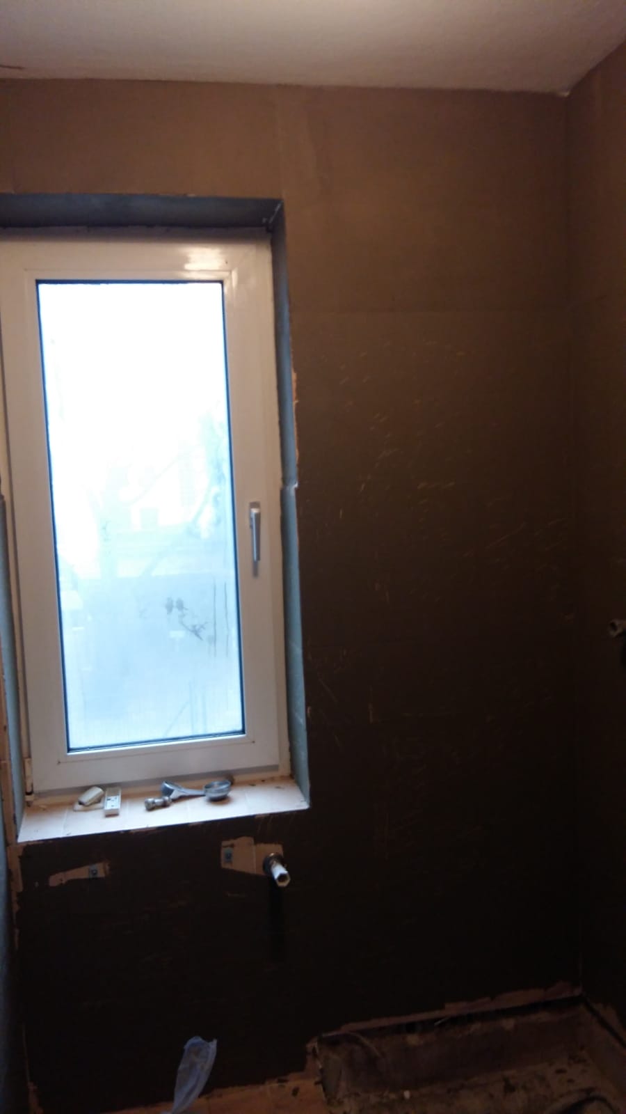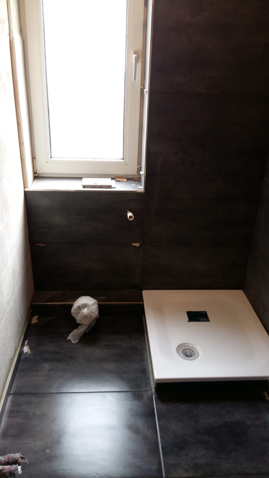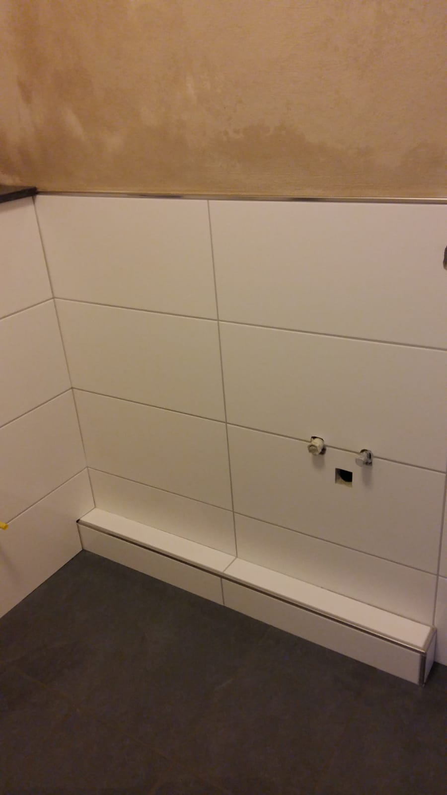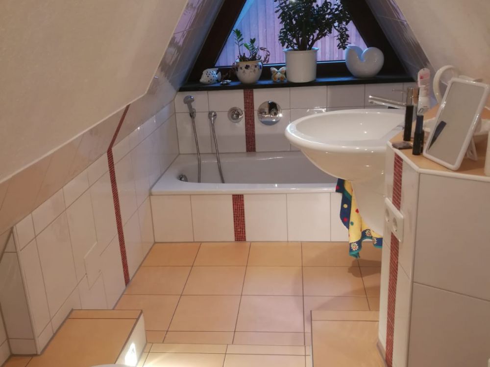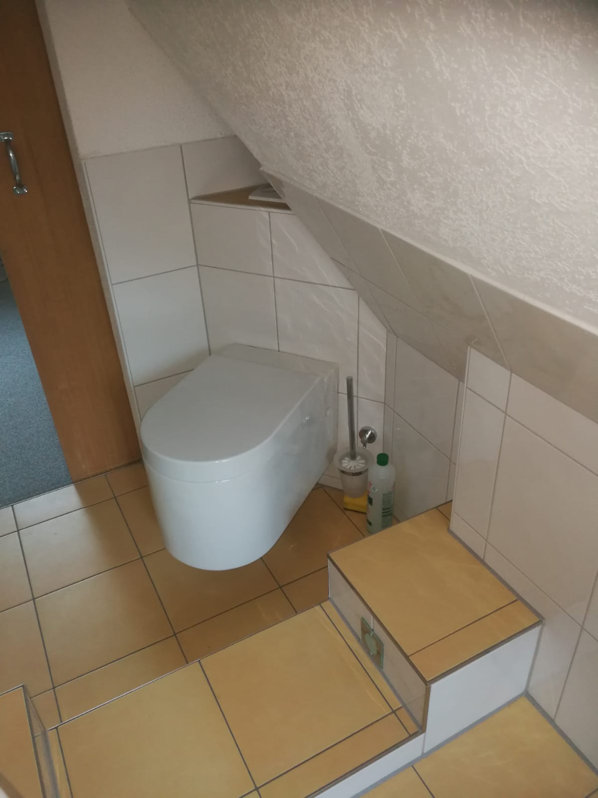 Hier handelt es sich um ein Badezimmer, welches in eine Gaube installiert wurde. Besondere Wünsche der Auftraggeber: Fußbodenheizung, flacher Einstieg in die Badewanne, WC-Anschluss 5 cm über Norm.