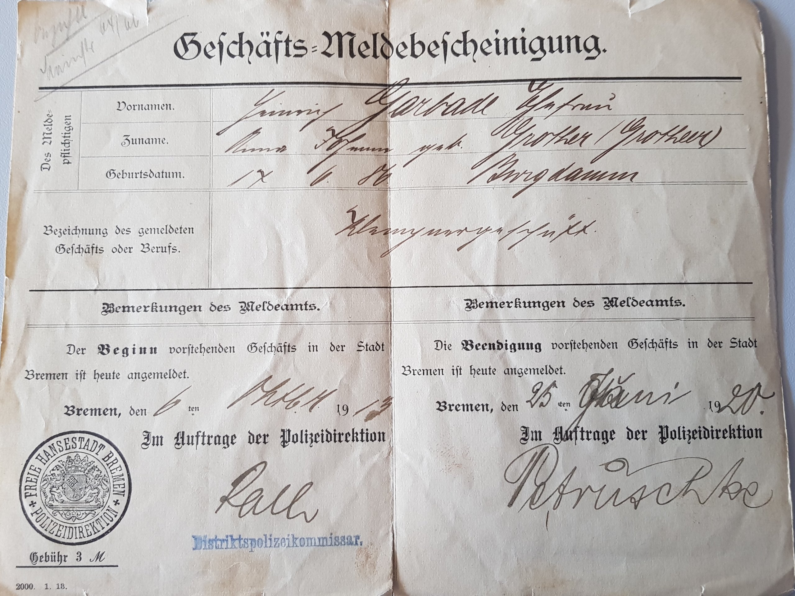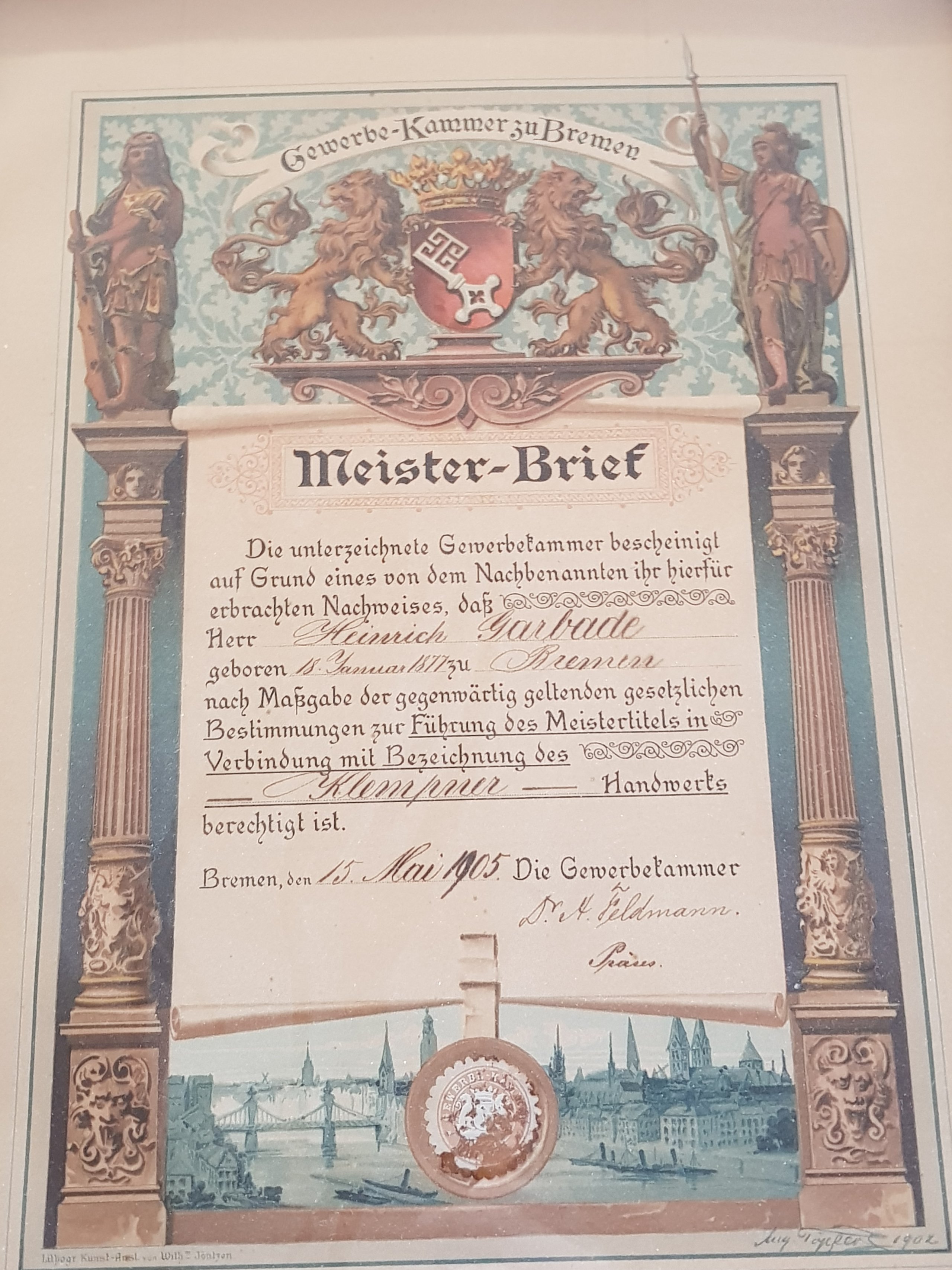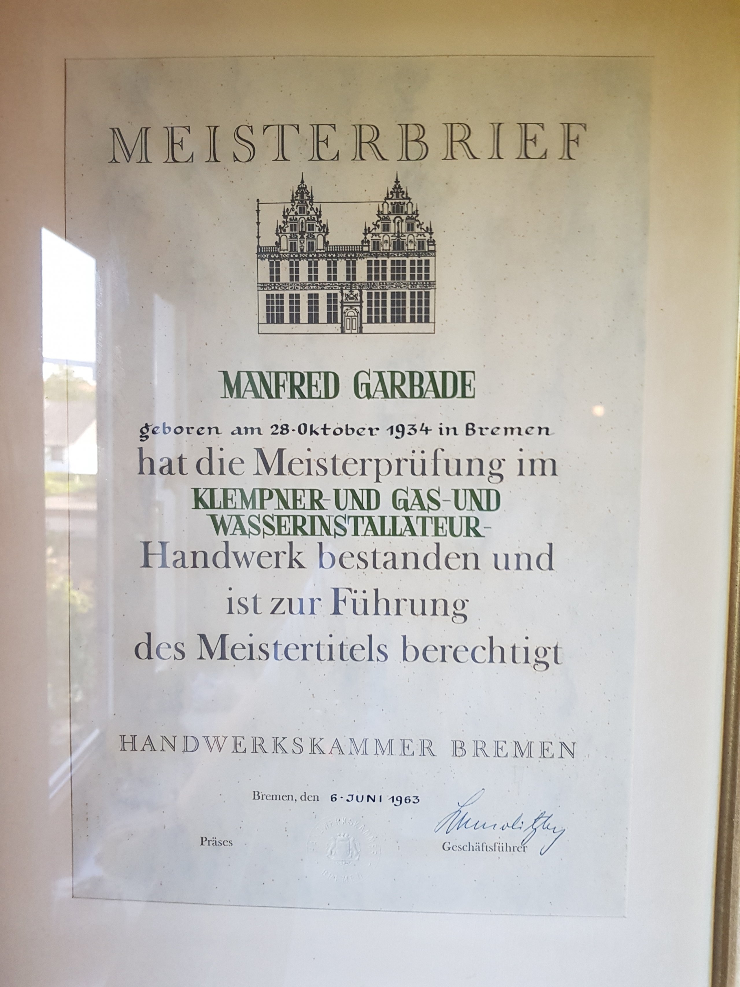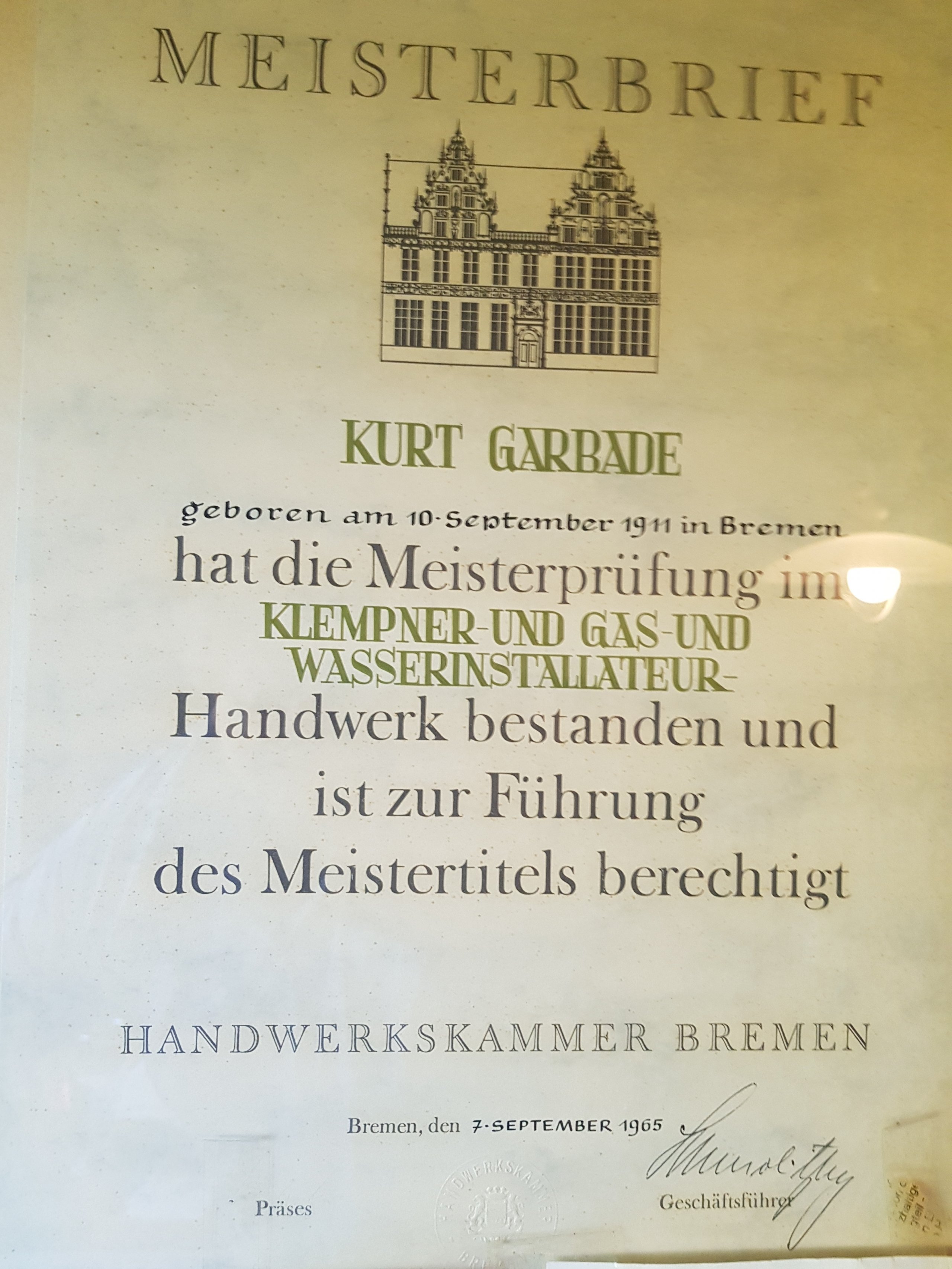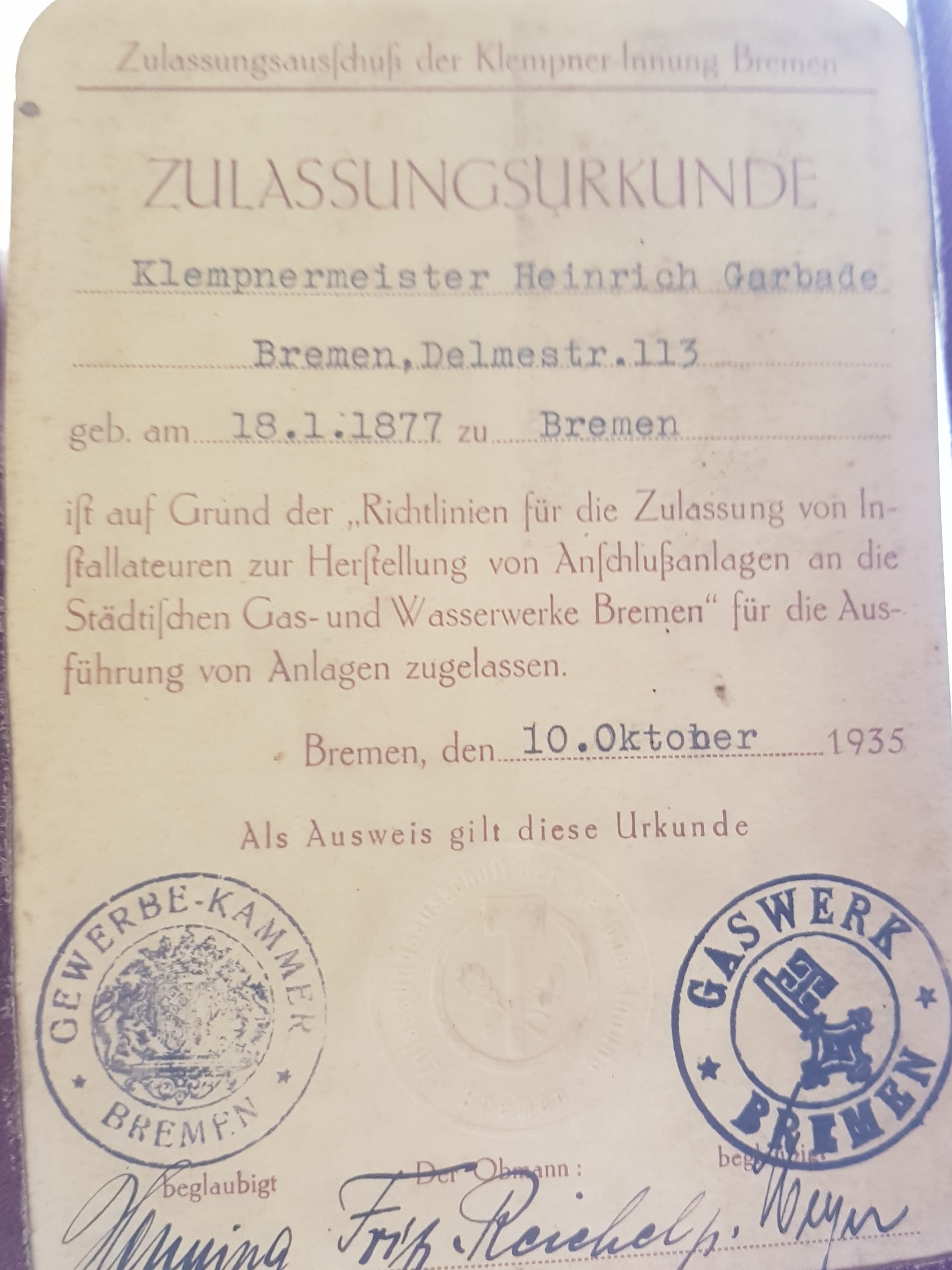 Bereits vor dem ersten Weltkrieg gibt es unsere Firma, allerdings muss Klempnermeister Heinrich Garbade in den Kriegsdienst und seine Frau kann das Unternehmen nur zwei Jahre aufrechterhalten. Doch nach dem ersten Weltkrieg gibt es das Comeback: Am 25. Januar 1920 macht sich Heinrich Garbade erneut selbstständig. Sein Sohn Kurt Garbade folgt ihm in dieser Tätigkeit, macht seinen Klempner- und Installateur-Meister und somit ist der Bestand des Unternehmens auch in der nächsten Generation gesichert.